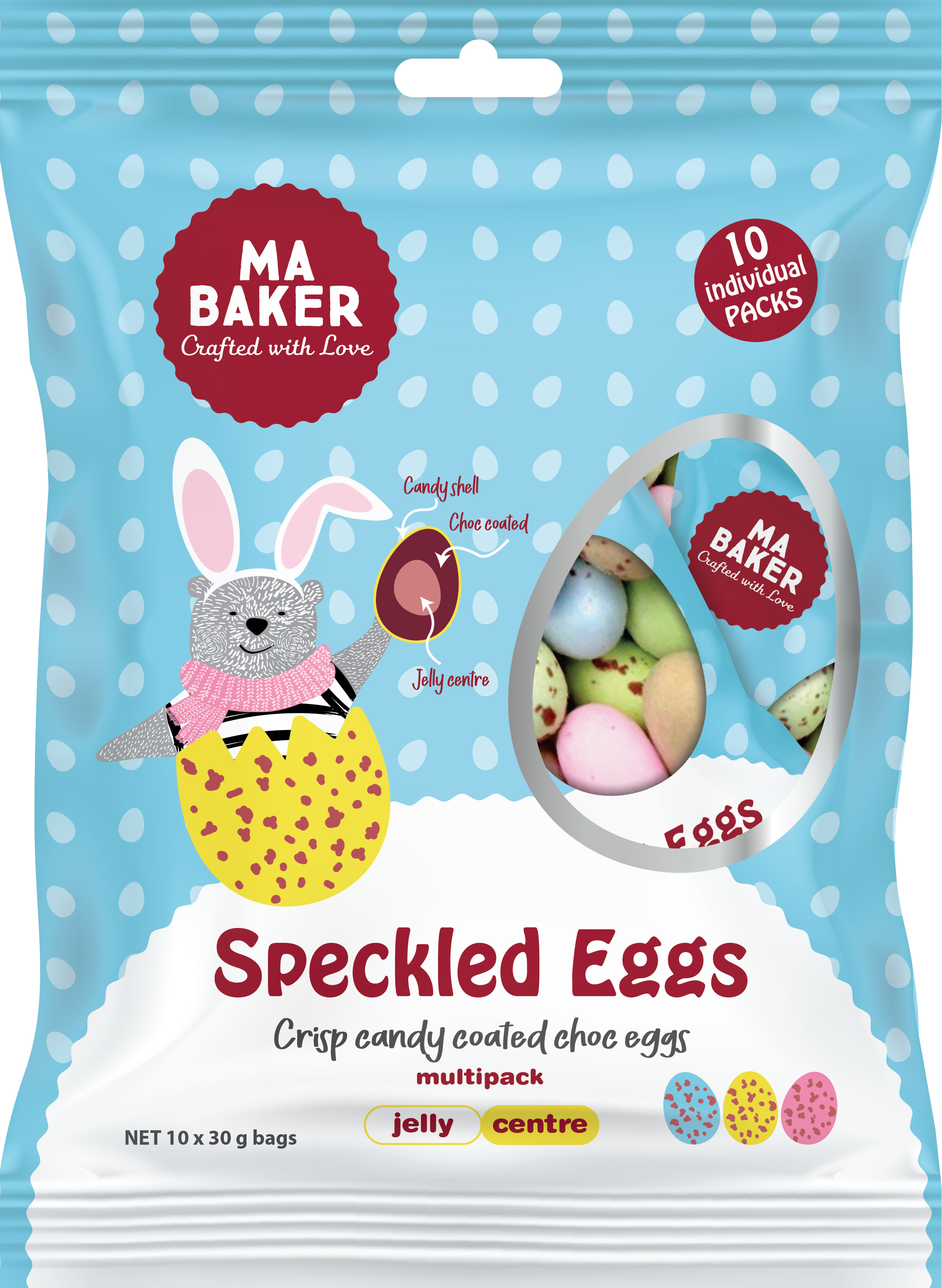 Dive into a burst of strawberry flavour with these speckled eggs. Featuring a creamy milk confection core, surrounded by a crunchy candy shell. The Ma Baker Speckled Egg pack comes with 10 individually wrapped bags making them convenient for sharing or snacking.
